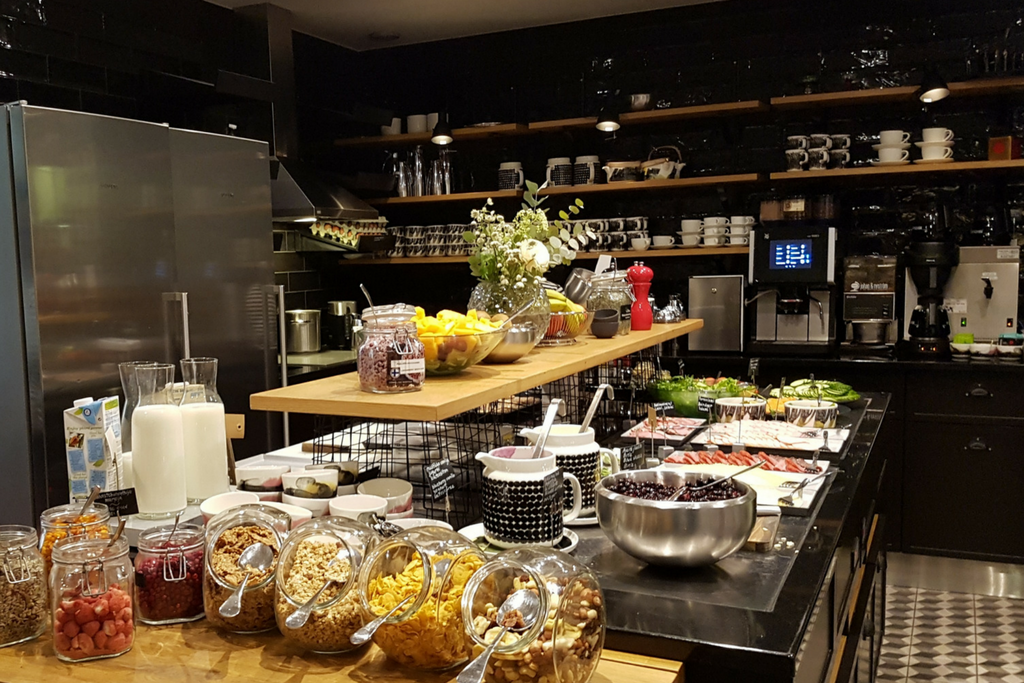 Muista hotelliaamiaisista F6 erottuu edukseen esimerkiksi sillä, että täällä aamiainen valmistetaan avokeittiössä, asiakkaiden silmien alla. Tämä jos mikä, on omiaan lisäämään kodinomaista ja lämmintä tunnelmaa. Itse tehdyt karjalanpiirakat paistuvat uunissa, samaan aikaan kun puuro kiehuu kotoisasti liedellä. Kauniit astiat ovat hyllyissä, ihan niinkuin kotona. Henkilökunta hymyilee ja vaihtaa ohimennen keskenään kuulumisiaan. Täällä ei ole kiusallista syödä yksinkään. Joskus se loistava hotellikokemus syntyy näinkin kotikutoisesti!