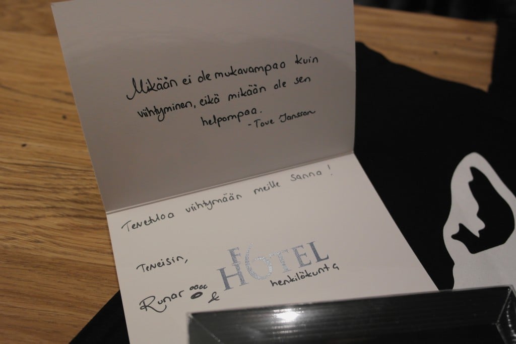 Hotelliin saapuessani minua odotti huoneen pöydällä pieni tervetuliaislahja kortteineen: