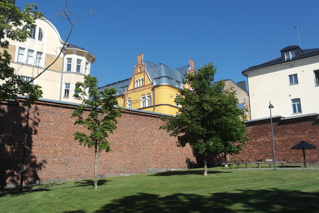 Niin kuin tuossa muutama rivi aiemmin tuli esiin, suojelee Museovirasto Katajanokan muureja ja ulkoseiniä. Näin se on varsin vaikuttavakin näky vanhoinen punatiilisine julkisivuineen. Näin koirien kanssa matkustavana sitä osasi arvostaa myös tuota isoa pihaa. Aikaiselle aamupissalle kun ei sen kauemmas lähteä tarvinnut.