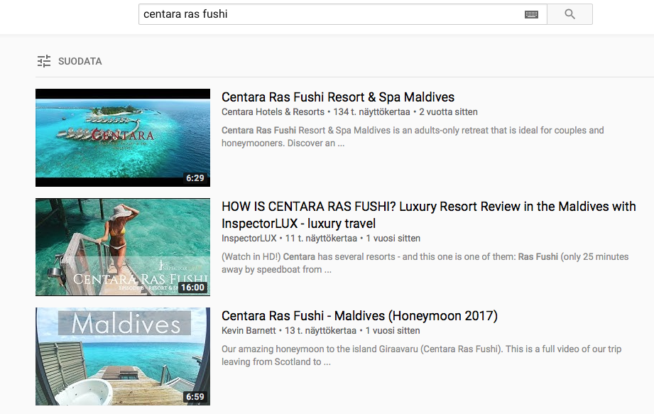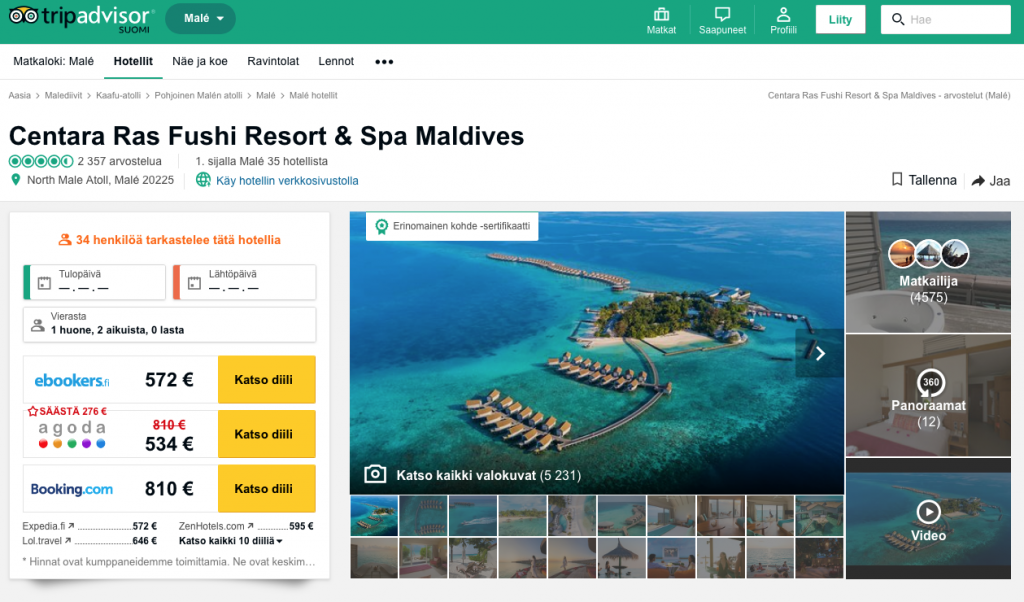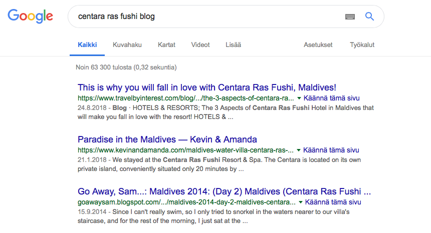 Jotta postaus ei olisi vain pelkkää tekstiä, käytän tässä esimerkkinä sitä, millaista taustatyötä tein meidän Malediivien resortin Centara Ras Fushin varauksen yhteydessä. Tuolle matkalle meidän hotellibudjetti oli 600 euroa/yö, joten todellakin halusin olla varma siitä, mitä tuohon hintaan saan.