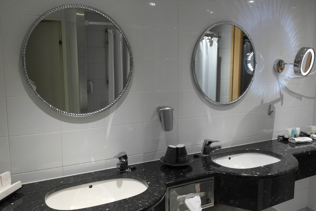 Kylpyhuoneessa pidin erityisesti siitä, että laskutilaa oli todellakin runsaasti. Ja kerrankin riittävästi. Marmoritasot olivat tyylikkäät ja mukit laadukasta Pentikiä. Suihkuja oli kaksi, josta isot plussat myös.