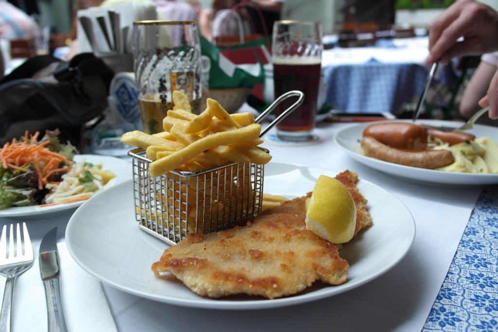 Me viihdyimme täällä niin hyvin, että kävimme toisenkin kerran. Tuolla ensimmäisellä kerralla meille riittivät syötäväksi brezelit (olivat muuten oikeasti hyviä ja euron taisivat maksaa), toisella kerralla ruokailimme kunnolla. Mies mutusteli tyytyväisenä perinteisiä makkaroita, minulle puolestaan maistui wieninleike.