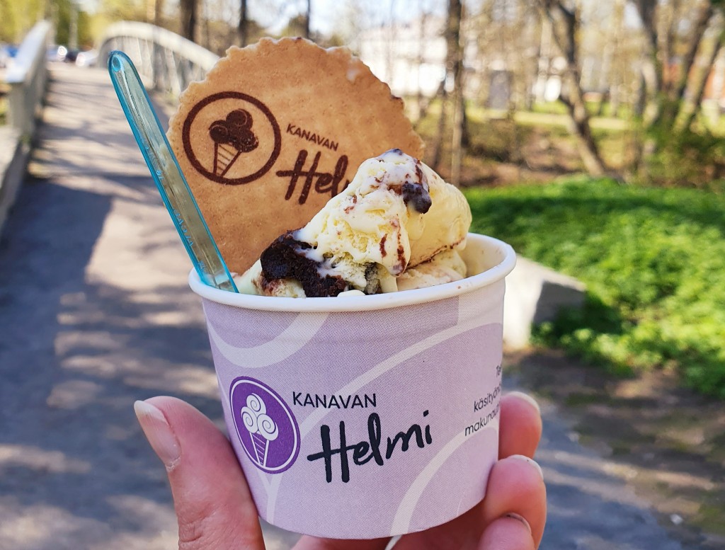 Itse olen hullaantunut Helmen pistaasijäätelöön siinä määrin totaalisesti, että muut maut ovat omasta kiposta usein jääneet pois. Pienellä muulla otannalla voin kuitenkin suositella ainakin myös suolapähkinää ja cookiejädeä, mies taas tykkää erityisesti sitruunasta. Perinteisiäkin makuja, kuten suklaata ja mansikkaa löytyy toki myös. Tarjolla on lisäksi pieni valikoima kahvilatuotteita.